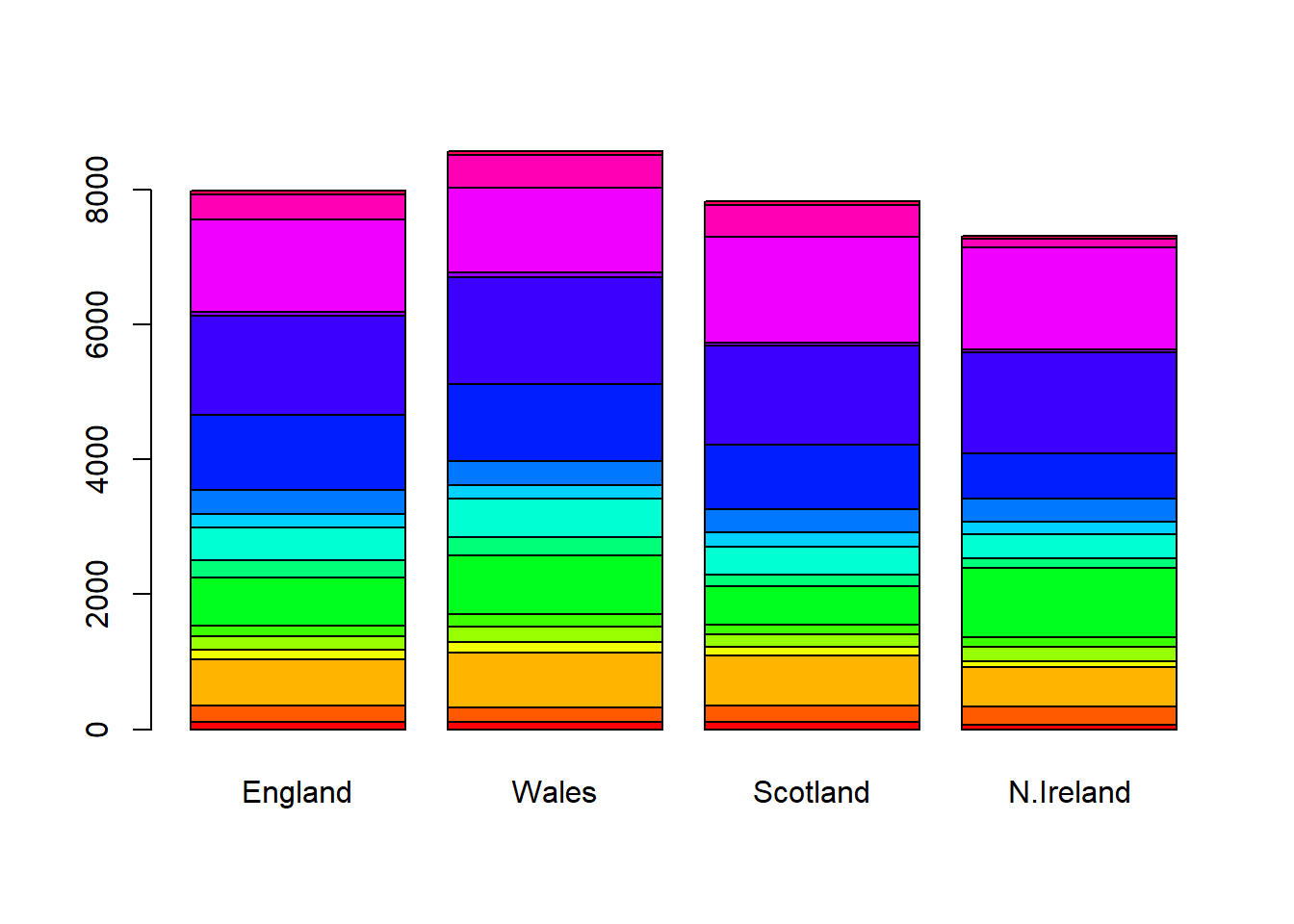 barplot(as.matrix(x), beside=F, col=rainbow(nrow(x)))