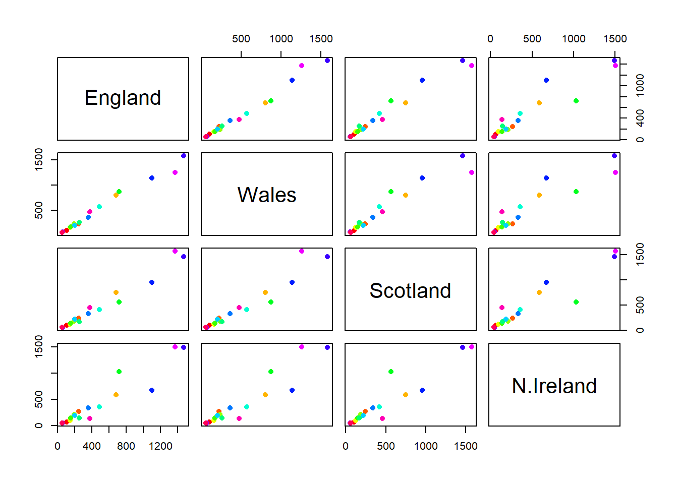 pairs(x, col=rainbow(nrow(x)), pch=16)