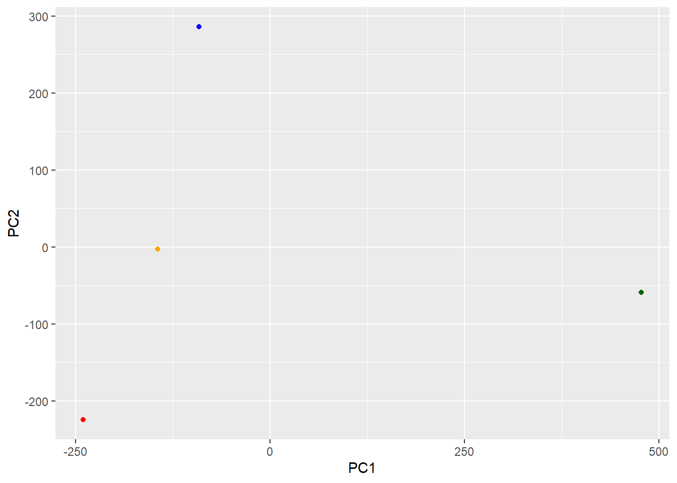 ggplot(pca$x) + aes(PC1, PC2) + geom_point(col=my_cols)