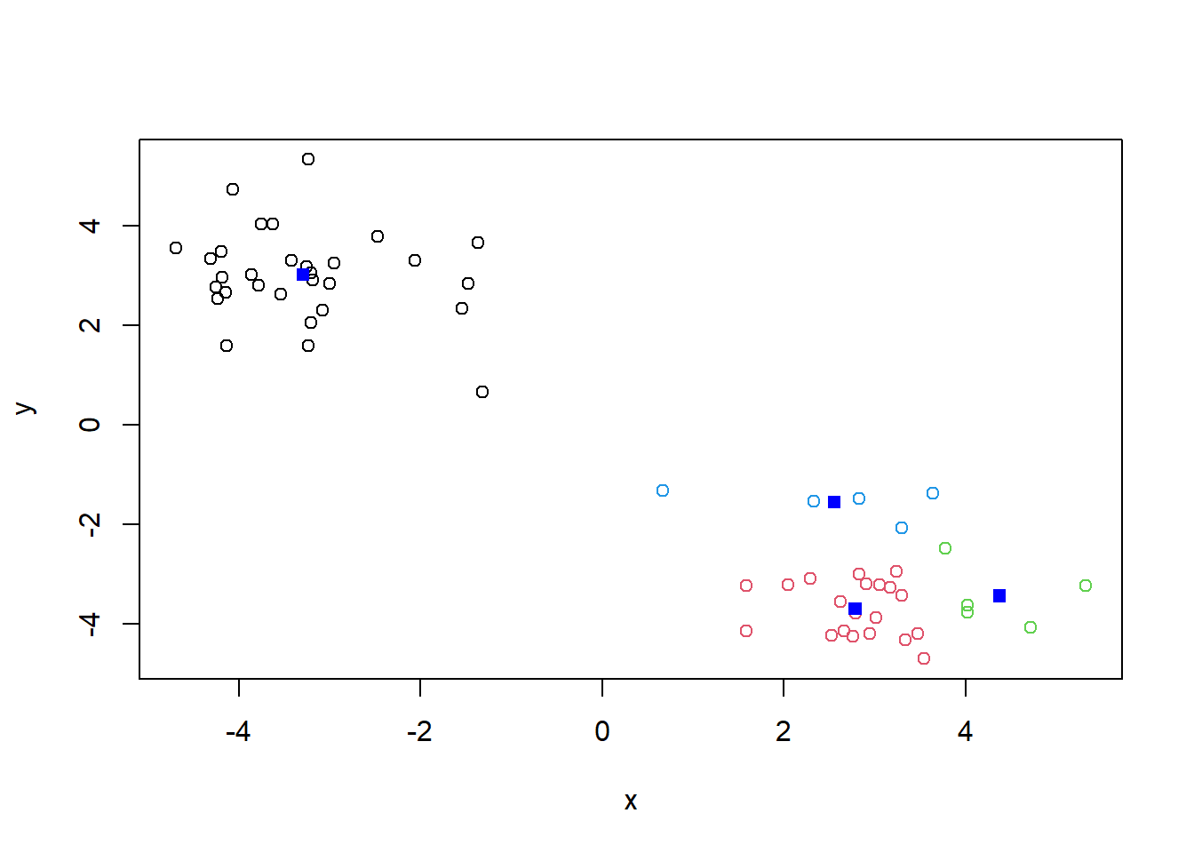 points(km$centers, col="blue", pch=15)