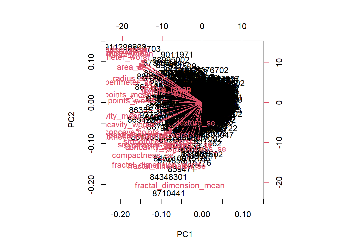 concave.points_meanis -0.26, in which the negative sign means it decreases the value of the PC. Given that there is no other value that is bigger thanconcave.points_mean, this loading vector is the largest contributor.