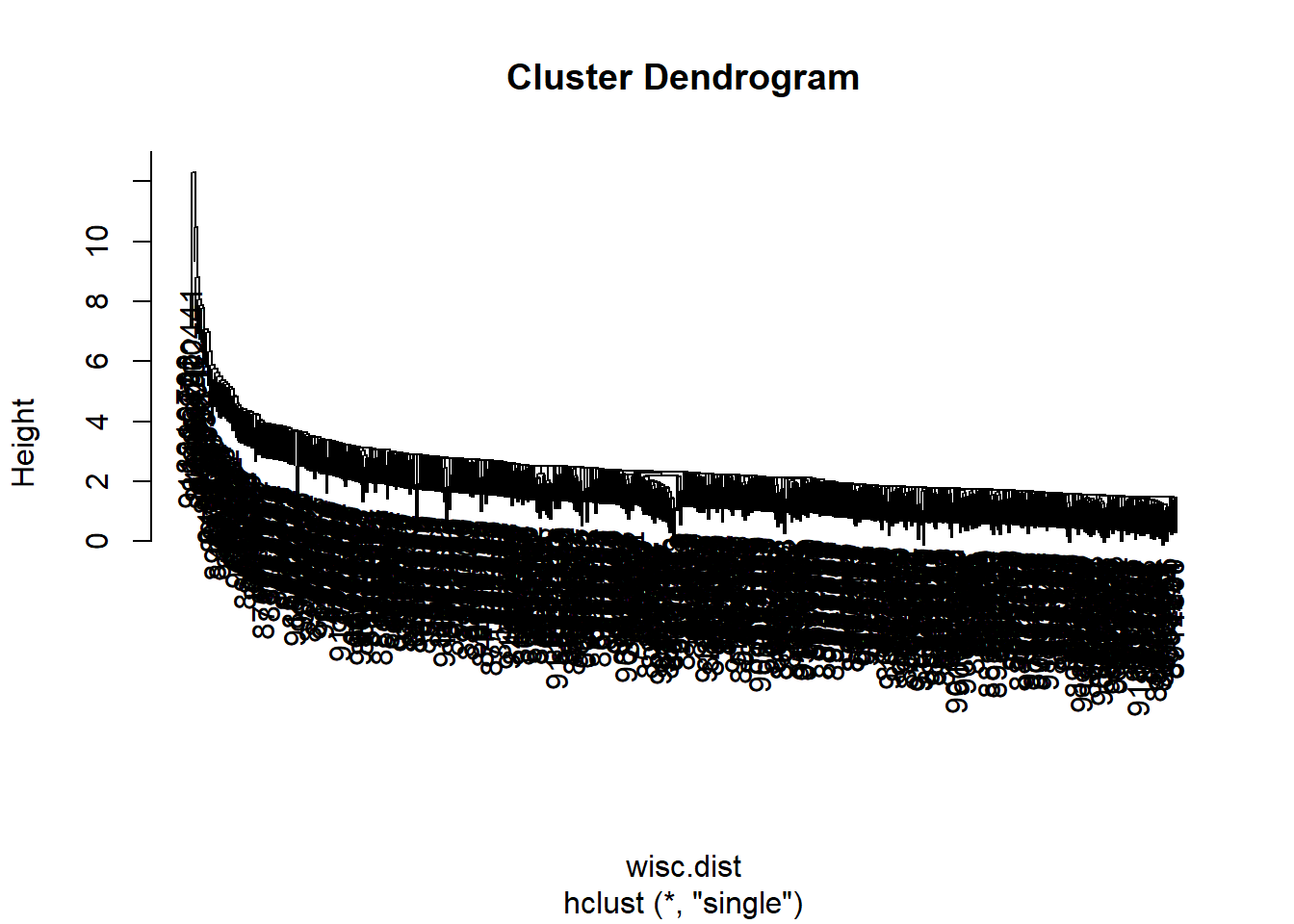 The idea here is that I can take my new variables (the scores on the PCs wisc.pr$x) that are better descriptors of the data set than the original features (i.e. the 30 columns in wisc.data) and use these as a basis for clustering.