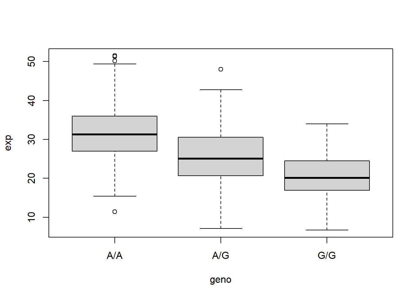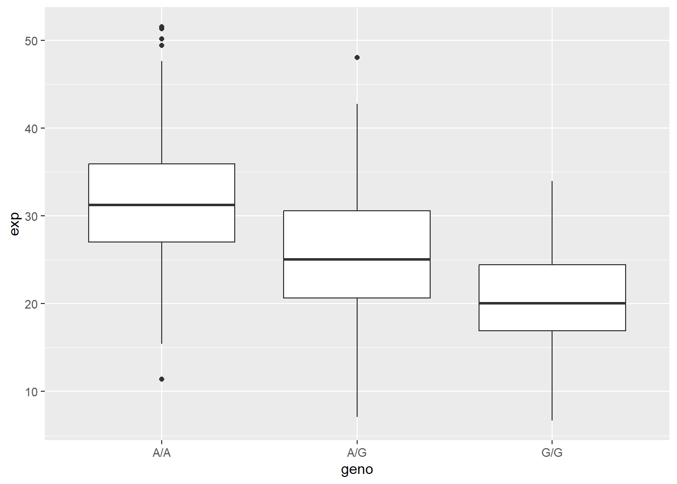 Q14: Generate a boxplot with a box per genotype, what could you infer from the relative expression value between A/A and G/G displayed in this plot? Does the SNP effect the expression of ORMDL3?